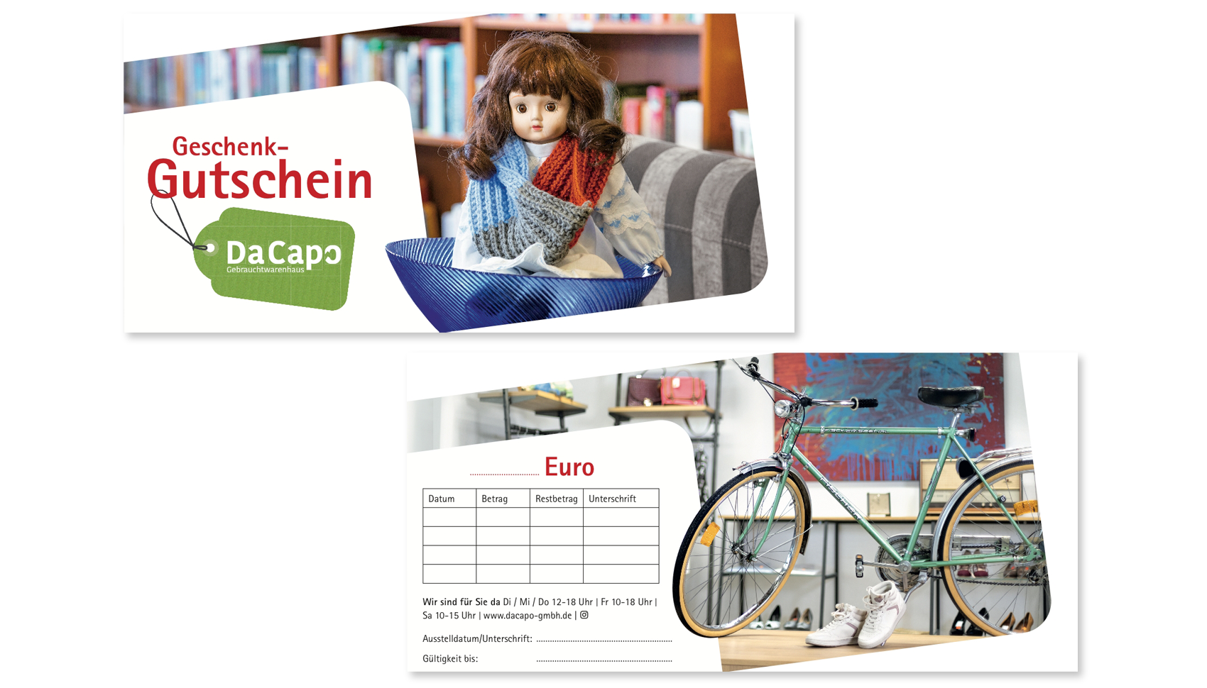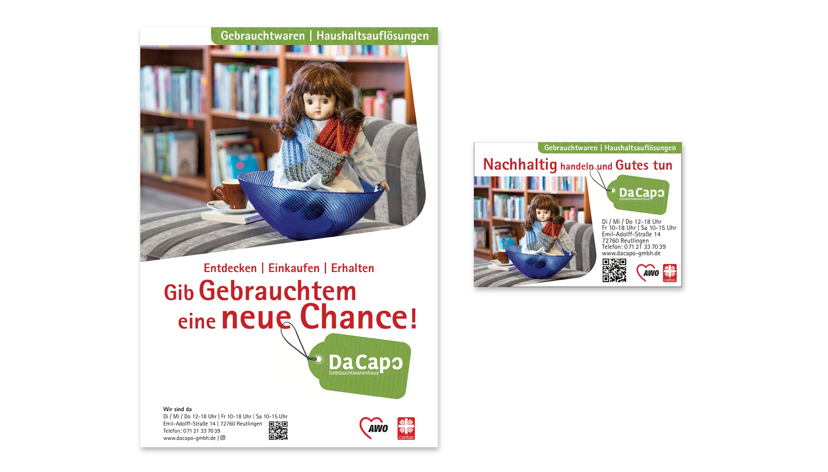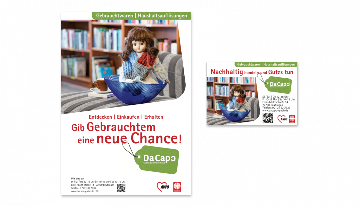 Was ist wirklich nachhaltig? Als das Gebrauchtwarenhaus Da Capo bei uns mit der Frage angeklopft hat, ob wir es in Sachen Neukonzeption ihres Logos und diverser Werbemittel unterstützen könnten, haben wir sehr gerne „Ja“ gesagt. Denn dort werden Werte gelebt, die in vielerlei Hinsicht Zukunft positiv gestalten. Auftakt unserer Kreativität war die Entwicklung eines neuen Logos, dessen individuelle Form aus den Da Capo-Verkaufsetiketten entstand. Das „Model“, das wir zum Gesicht von Da Capo gemacht haben, saß einst in den Regalen des Gebrauchtwarenhauses – heute lebt es wieder ganz neu und steht für die Wertschätzung gebrauchter Dinge und die freundliche Atmosphäre im Haus.