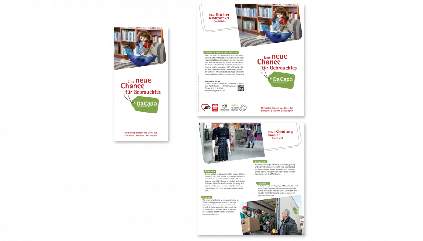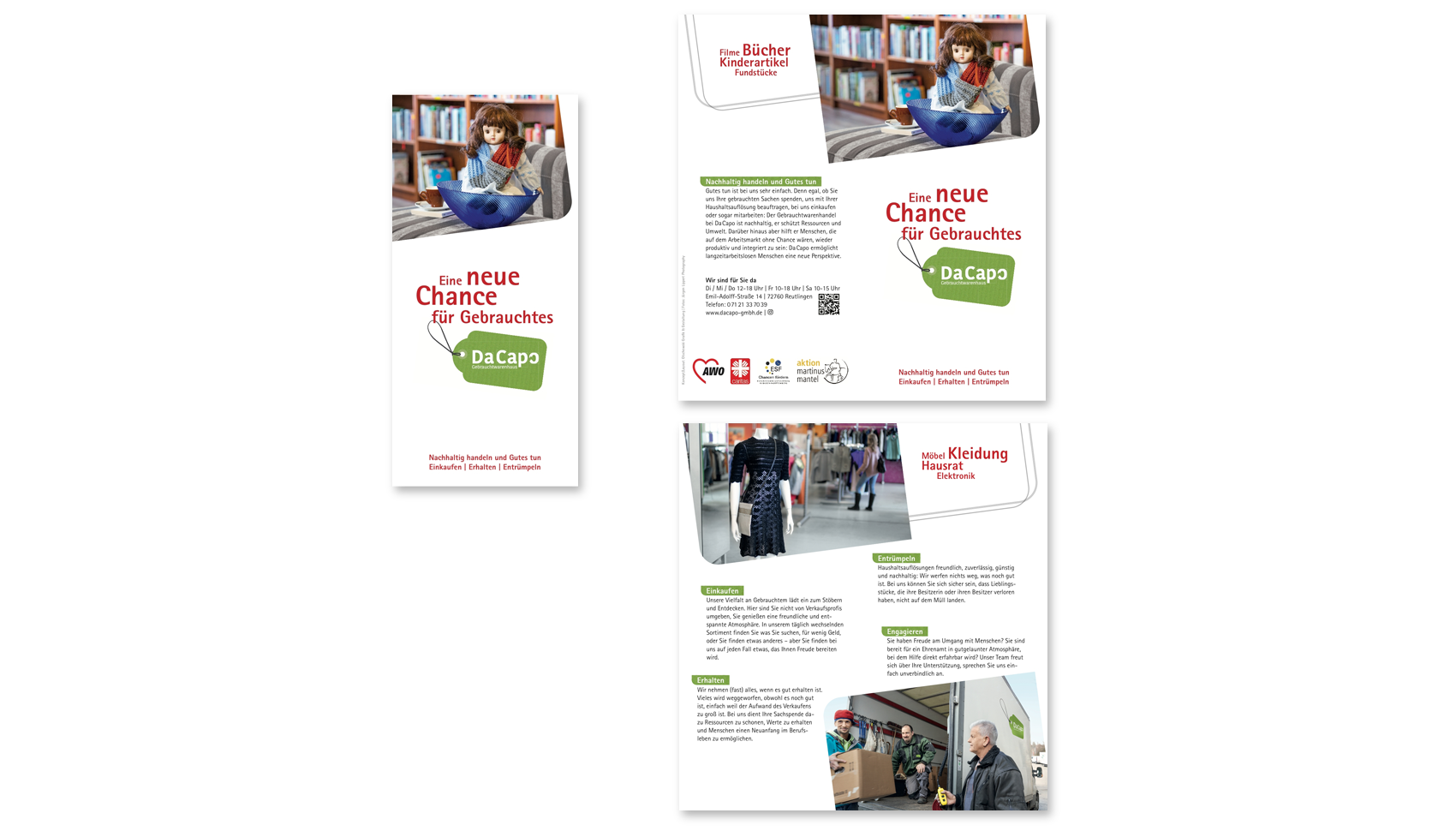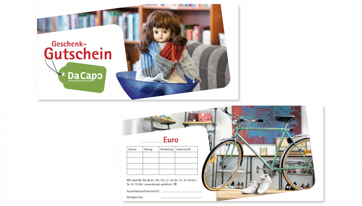 Was ist wirklich nachhaltig? Als das Gebrauchtwarenhaus Da Capo bei uns mit der Frage angeklopft hat, ob wir es in Sachen Neukonzeption ihres Logos und diverser Werbemittel unterstützen könnten, haben wir sehr gerne „Ja“ gesagt. Denn dort werden Werte gelebt, die in vielerlei Hinsicht Zukunft positiv gestalten. Auftakt unserer Kreativität war die Entwicklung eines neuen Logos, dessen individuelle Form aus den Da Capo-Verkaufsetiketten entstand. Das „Model“, das wir zum Gesicht von Da Capo gemacht haben, saß einst in den Regalen des Gebrauchtwarenhauses – heute lebt es wieder ganz neu und steht für die Wertschätzung gebrauchter Dinge und die freundliche Atmosphäre im Haus.